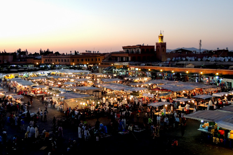 In the afternoon, we wanted to visit the Jardin Majorelle. Despite the distance, we decided to walk there, but all we met there was just a closed doors, because none of us imagined that even in parks have opening hours. We awaited a sunset at one of the patio, where we met main square in a typical image, which traced to a number of photos. Market was flooded with bigger stalls, where they offer traditional food and drinks. In addition, to get their money as street artists, they hosting some kind of music workshops, staged skits, playing to their cobras, walking monkeys and much more. Our attention is also attracted the crowd gathered in circle, they were watching boxing or more funny version of street fighting.